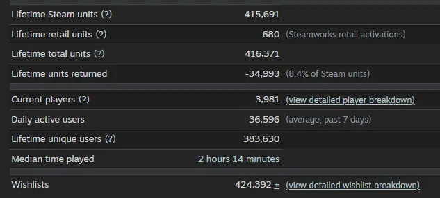 Как пишет Кирилл Орешкин, к вечеру 30 числа валовая выручка игры на платформе Valve достигла 500,3 тысяч долларов. Е` «чистый» заработок после комиссий, налогов и возвратов — 405,8 тысяч долларов.