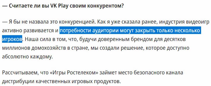 Вице-президент по продуктам массового сегмента «Ростелекома» не считает «Игры Ростелеком» конкурентом VK Play